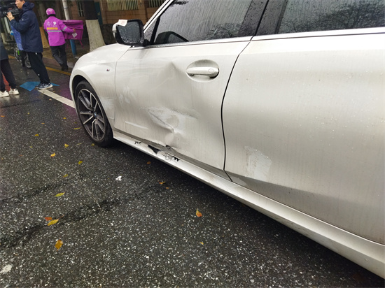 原來(lái),當(dāng)天上午9時(shí)許,這名外賣(mài)小哥騎著電動(dòng)車行駛到上述路口時(shí),正好碰見(jiàn)對(duì)向的一輛網(wǎng)約車司機(jī)左轉(zhuǎn)彎,由于天雨路滑,剎車來(lái)不及,為緊急避險(xiǎn),外賣(mài)小哥慌亂中撞向了旁邊停放的一輛寶馬3系車,于是出現(xiàn)了上述一幕!