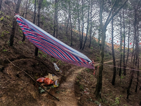 6月16日施工方補(bǔ)設(shè)的邊坡防護(hù),僅為用竹筷固定的普通漁網(wǎng))