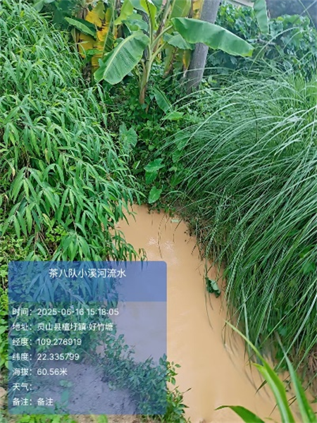 村民擔(dān)憂施工會(huì)污染山泉水源,這點(diǎn)在6月變成了現(xiàn)實(shí):恰逢兩廣暴雨,在雷雨后,村民發(fā)現(xiàn)從山北面流出的泉水充滿了泥漿,從清澈變得渾濁和土黃。不僅是飲水受到影響,下游耕作的農(nóng)田也因此被淤泥阻塞。