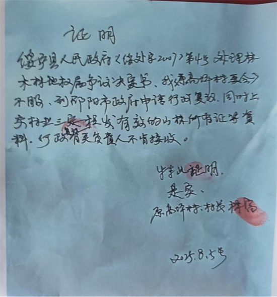 對(duì)于綏寧縣政府的辯解,周順馮說,2017年4月18日,何愛勇、林富出具了證明,高坪村干部當(dāng)時(shí)根本就沒有收到郵寄通知書。