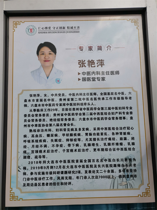 走進(jìn)貴州省盤州市中醫(yī)醫(yī)院亦資院區(qū)大門,墻上掛著許多名醫(yī)、專家的照片和簡介,張艷萍名醫(yī)就在其中。