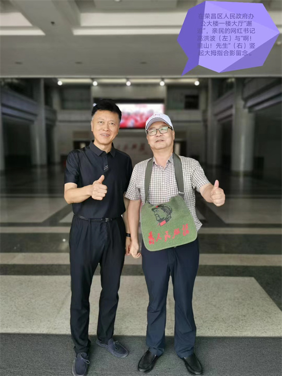 就這樣,就在榮昌區(qū)人民政府辦公大樓一樓的大廳里,不是一般親民的網(wǎng)紅書記高洪波同志,很自然的就與中國民間社會活動家“?。±锷?!先生”合影留念了。