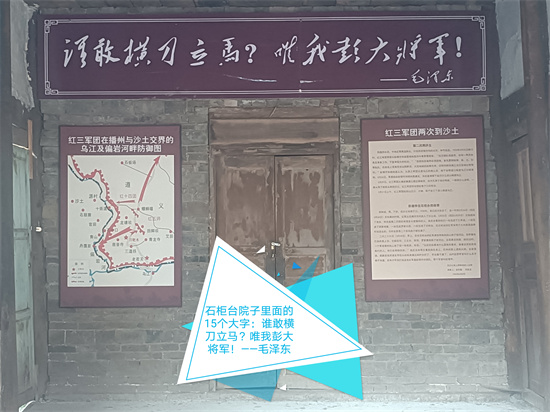 仔細(xì)看完墻上的宣傳展示,才總算明白過來,原來,90年前的1935年3月底,在中央紅軍四渡赤水后的南渡烏江前夕,紅三軍團(tuán)軍團(tuán)長彭德懷,政委楊尚昆,政治部主任劉少奇,參謀長葉劍英,第十一團(tuán)政委張愛萍,第十三團(tuán)團(tuán)長彭雪楓,以及直屬收容隊(duì)隊(duì)長胡耀邦等紅三軍團(tuán)領(lǐng)導(dǎo)人,都曾在石柜臺住過。