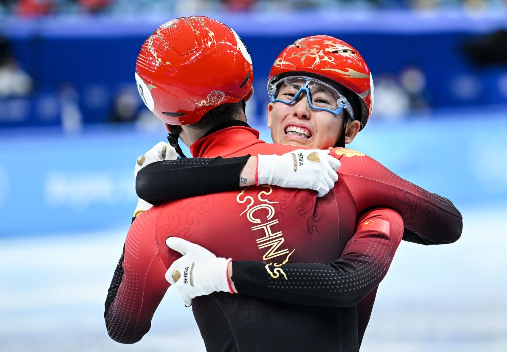 2022年2月5日,范可新(右)在北京冬奧會(huì)短道速滑男女混合接力決賽后慶祝。