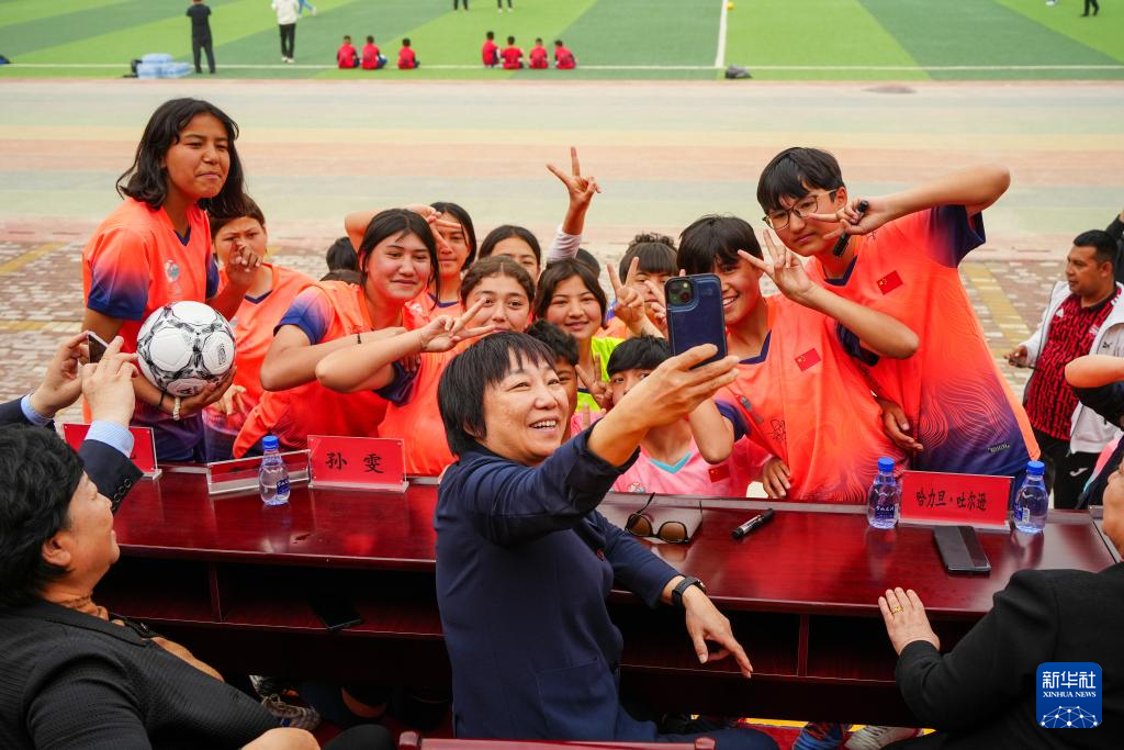 4月12日,2025新疆克孜勒蘇柯爾克孜自治州足球聯(lián)賽在阿圖什市開幕,中國足協(xié)副主席、前中國國家女子足球隊球員孫雯出席開幕式。姑娘們激動地與偶像孫雯合影,并說:“長大后我想成為你!”孫雯笑著答道:“你們可以成為更好的自己。”