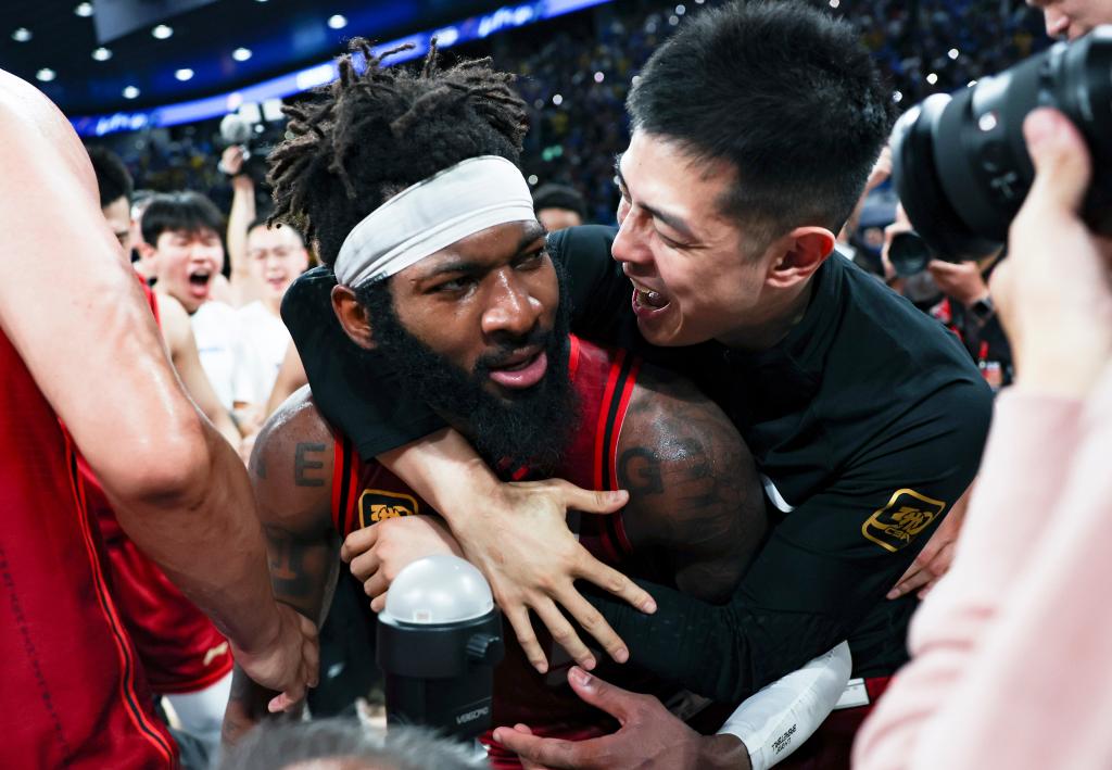 5月2日,北京北汽隊球員杰曼(左)和隊友方碩在比賽后慶祝。當(dāng)日,在2024-2025賽季中國男子籃球職業(yè)聯(lián)賽(CBA)季后賽半決賽第三場比賽中,北京北汽隊主場121比103戰(zhàn)勝山西汾酒隊,總比分3比0晉級總決賽。新華社記者 雒圓 攝
