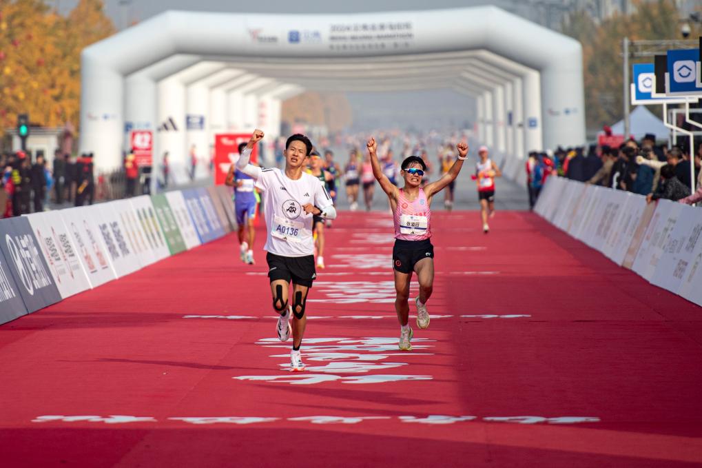 2024年11月3日,2024北京馬拉松賽暨全國馬拉松錦標(biāo)賽(第3站)在京舉行。參賽選手沖向位于奧林匹克公園的終點線。(新華社記者 陳鐘昊攝)