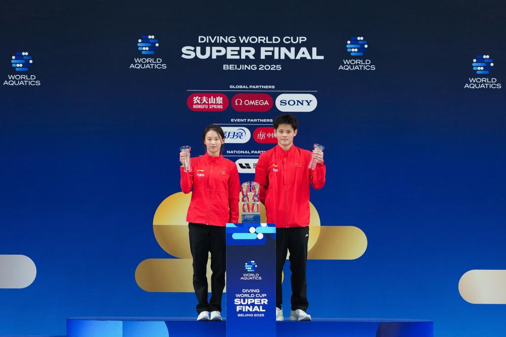 5月4日,朱子鋒(右)和陳芋汐在頒獎儀式上。當(dāng)日,2025年世界泳聯(lián)跳水世界杯總決賽落幕。在賽后舉行的2025年世界泳聯(lián)跳水世界杯年度最佳運動員頒獎儀式上,中國運動員朱子鋒、陳芋汐分獲年度最佳男子、女子運動員稱號。新華社發(fā)(那宇奇攝)
