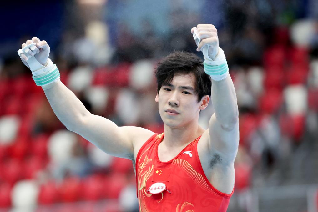 5月19日,張博恒在單杠比賽后慶祝。新華社記者 許雅楠 攝