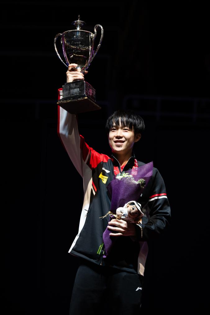 冠軍中國選手王楚欽在頒獎儀式上高舉獎杯。新華社記者 肖藝九 攝