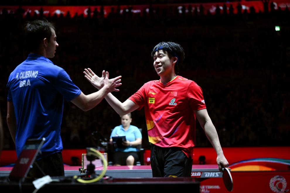 王楚欽(右)和雨果·卡爾德拉諾在賽后相互致意。新華社記者 賀長山 攝