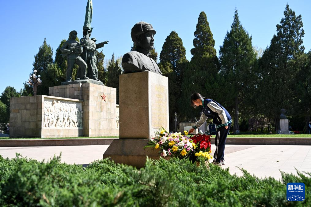 4月1日,在位于石家莊市的華北軍區(qū)烈士陵園,一名學生向烈士塑像獻花。