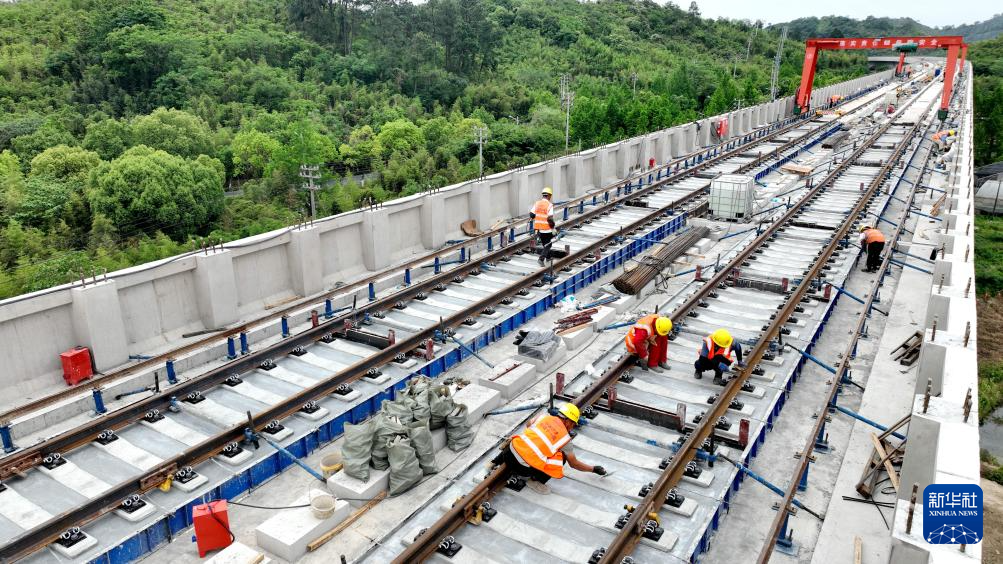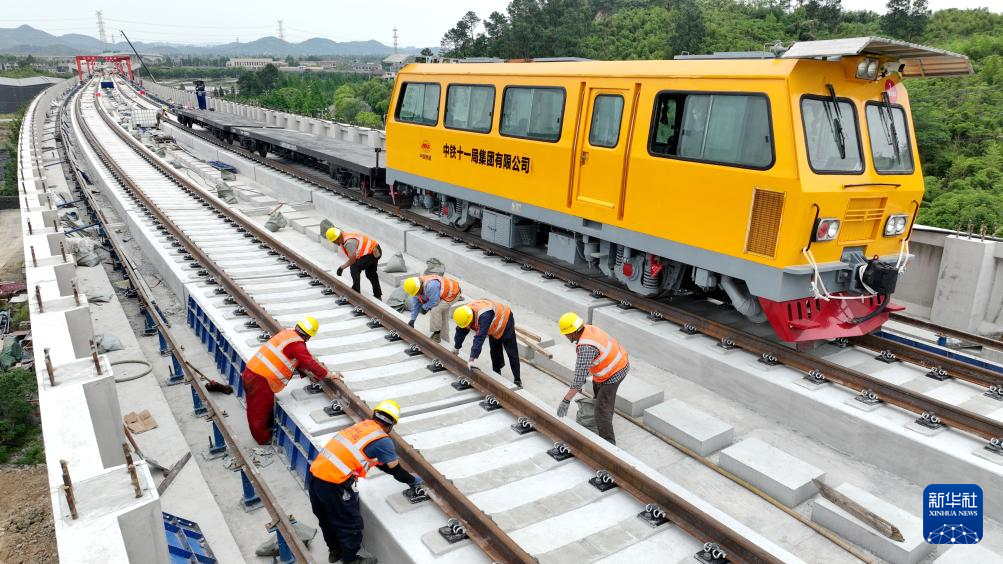 5月4日,中鐵十一局建設(shè)者在浙江省湖州市德清縣杭德市域鐵路高架線鋪軌現(xiàn)場(chǎng)作業(yè)(無人機(jī)照片)。