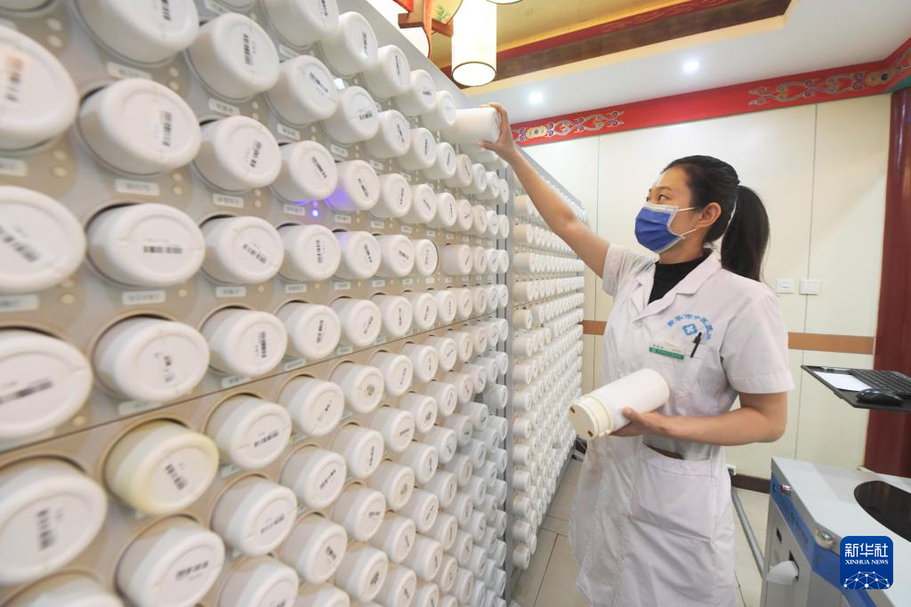 5月3日,中藥師在河北省石家莊新樂市中醫(yī)院中藥房給患者抓藥。