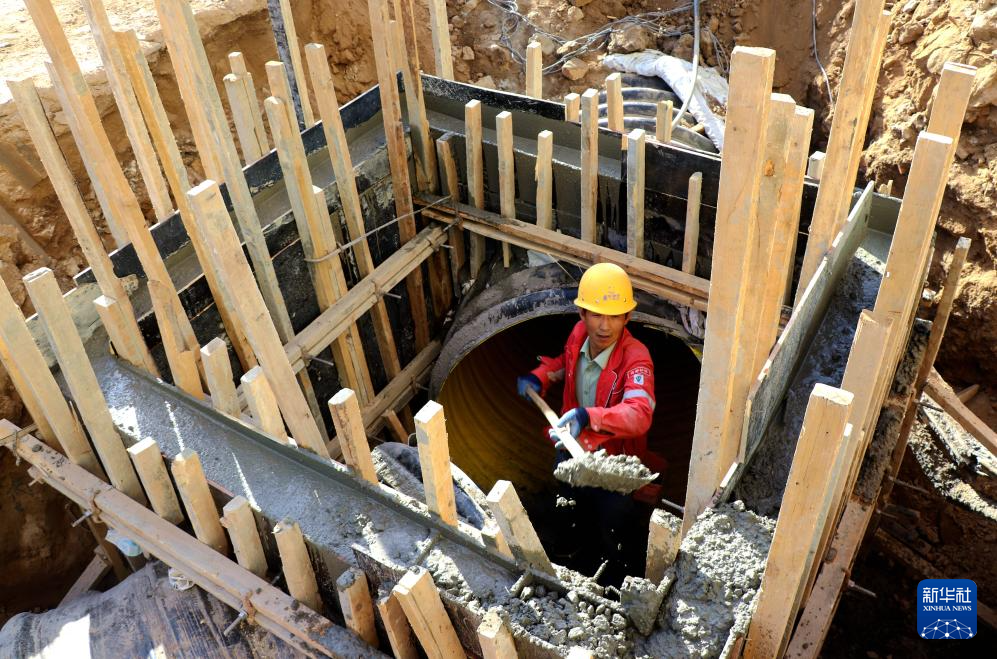 5月2日,在甘肅省平?jīng)鍪徐o寧縣城關(guān)鎮(zhèn)南關(guān)村,建設(shè)者在城區(qū)供水管網(wǎng)漏損治理工程建設(shè)工地施工。