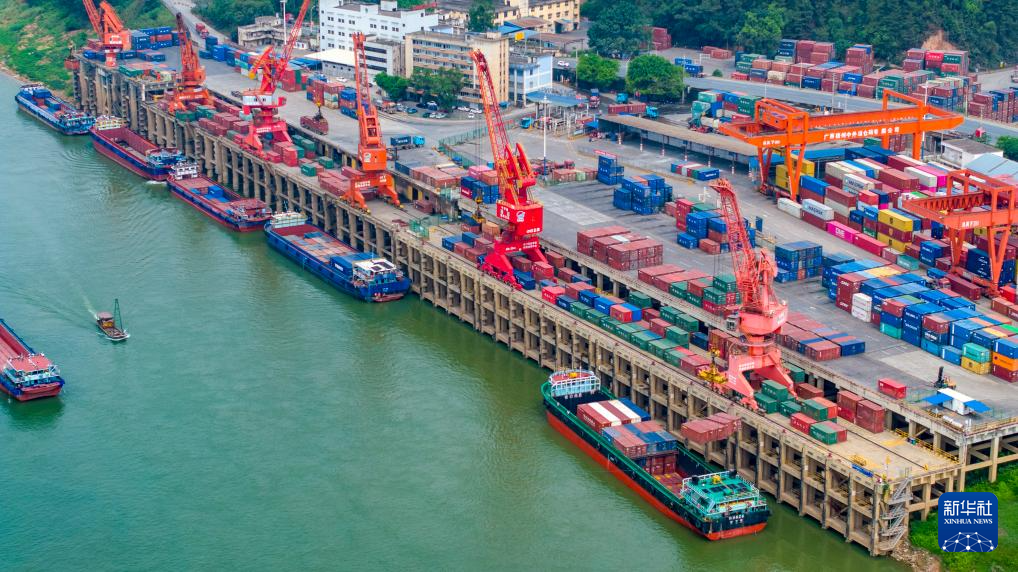5月3日,廣西梧州港李家莊作業(yè)區(qū),卡車往來穿梭,船舶正在進(jìn)行裝卸作業(yè)(無人機(jī)照片)。
