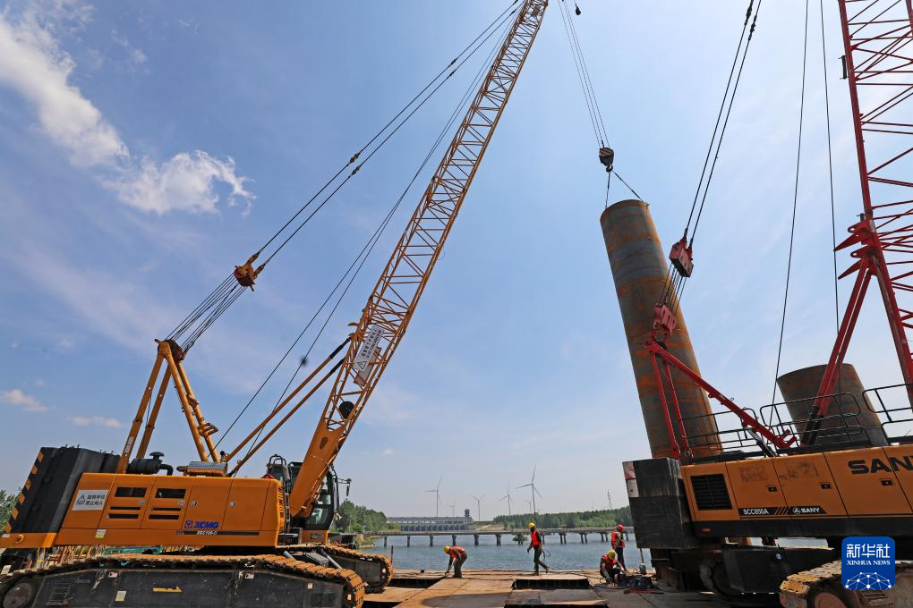 5月3日,中鐵上海局工人在濰宿高鐵山東省臨沂市郯城縣段進(jìn)行沭河特大橋施工。