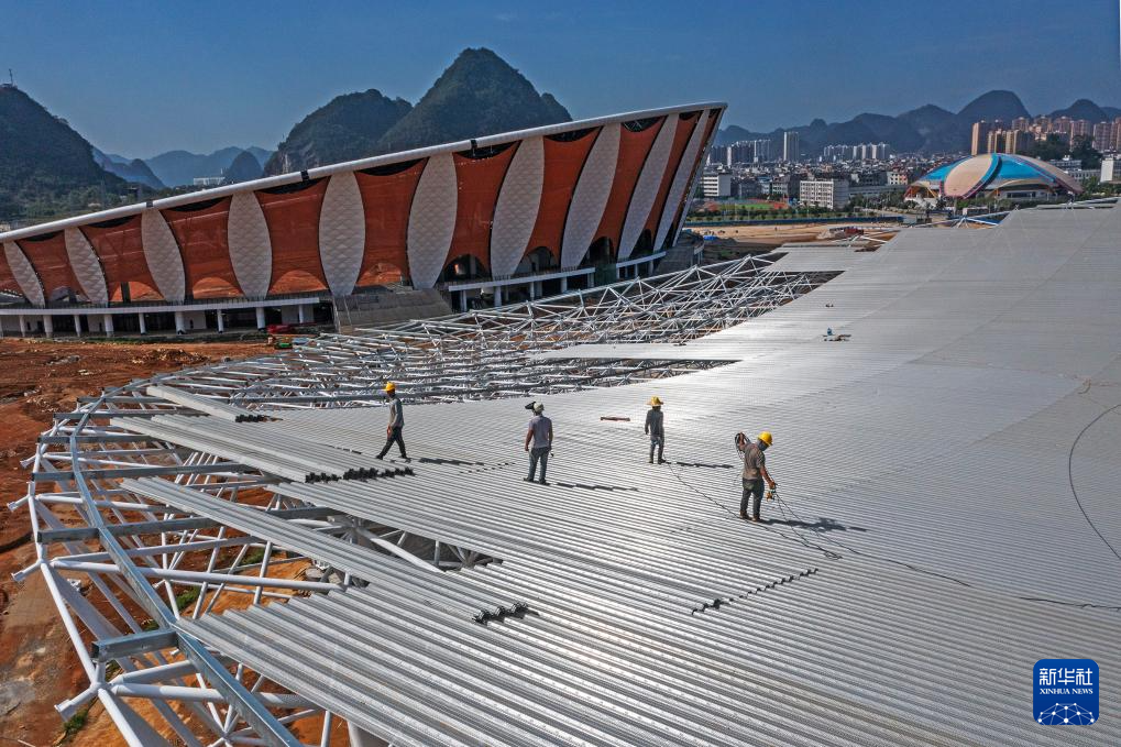 5月2日,工人在廣西靖西市乒乓主題體育公園樓體建設(shè)屋面施工(無人機(jī)照片)。
