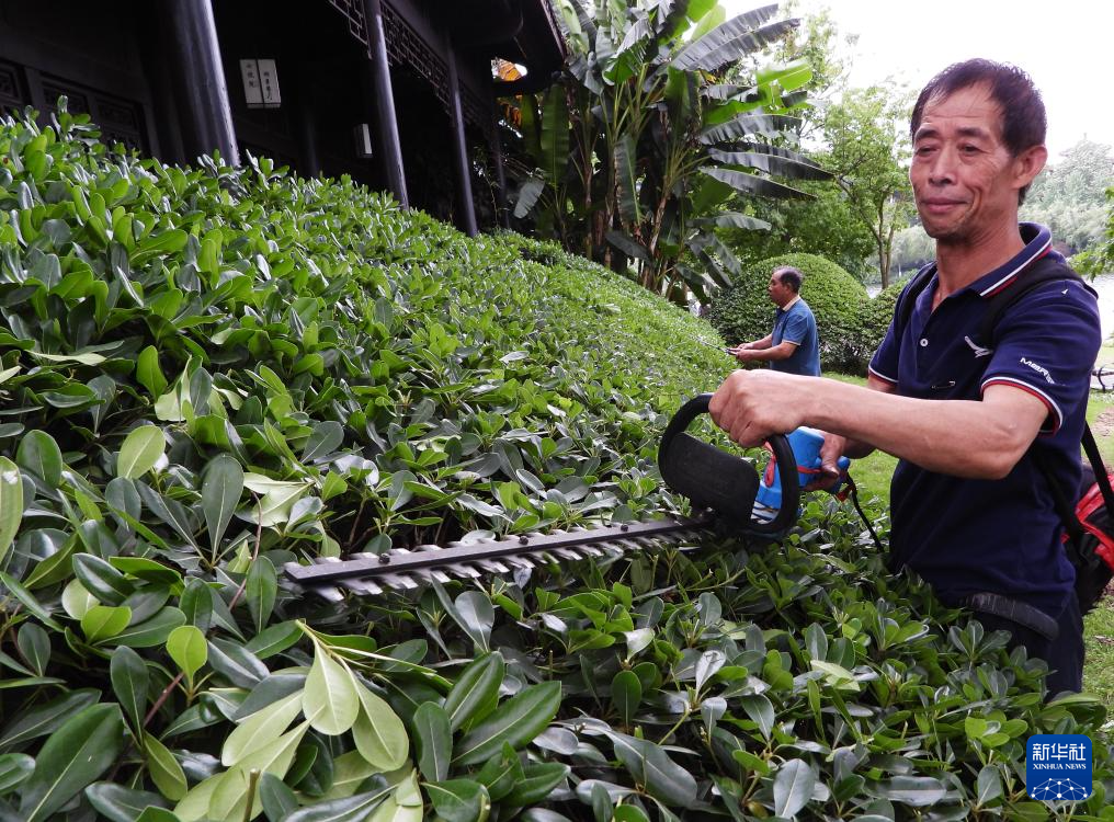 5月4日,四川省達(dá)州市渠縣園林工人操作修剪機(jī)進(jìn)行綠化帶管護(hù)。
