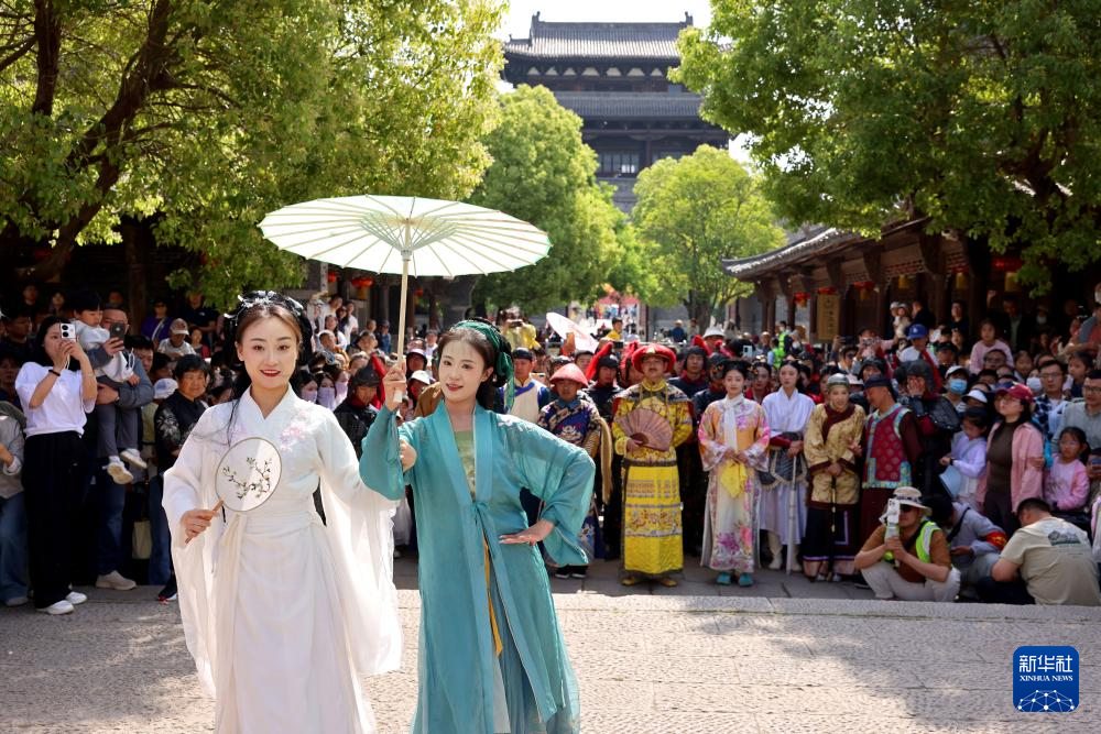 5月4日,在山東省棗莊市臺(tái)兒莊古城,青年演職人員在為游客表演節(jié)目。