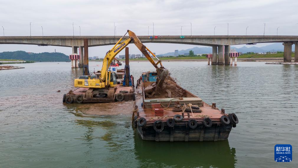 5月4日,浙江省金華市婺城區(qū)衢江航道江面上,錢塘江(杭州八堡—衢州雙港口)三級(jí)航道整治工程船在進(jìn)行航道疏浚作業(yè)(無人機(jī)照片)。