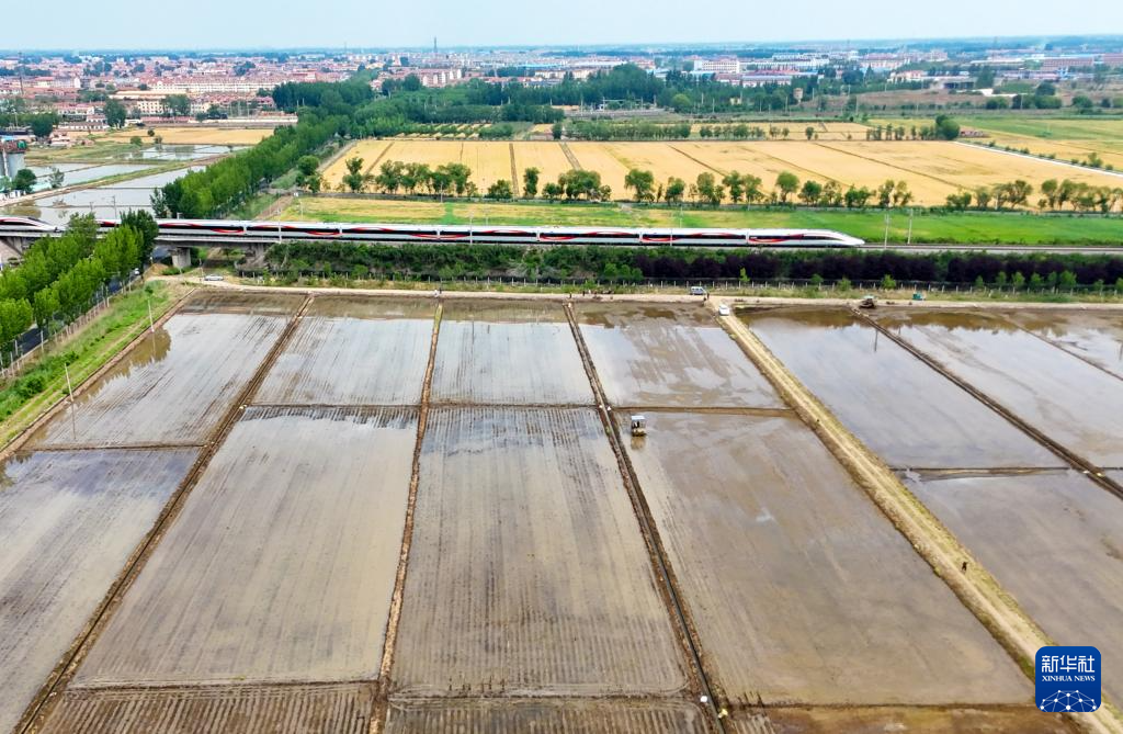 6月2日,列車從山東省青島市即墨區(qū)藍(lán)村街道青香水稻種植合作社的稻田旁駛過(guò)(無(wú)人機(jī)照片)。