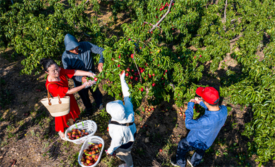 2025年6月5日,芒種至,標(biāo)志著初夏結(jié)束,盛夏啟章。在安徽省合肥市廬江縣冶父山鎮(zhèn)明圣村建大果園種植家庭農(nóng)場(chǎng),游客正在體驗(yàn)黃桃采摘游的樂趣。