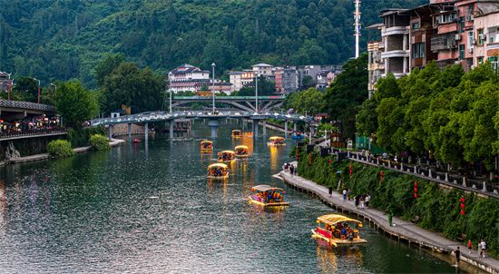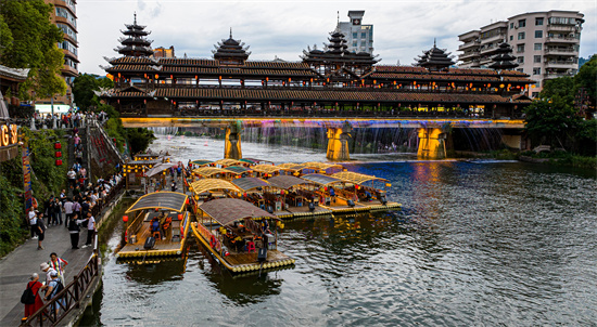 2025年6月14日,在流經(jīng)湖北省恩施土家族苗族自治州宣恩縣縣城的貢水河上,十?dāng)?shù)支花式游船游弋而過,迤邐的漁燈,與侗族建筑中最具特色的民間建筑之一文瀾橋以及兩岸古樸的土家族、苗族特色古民居建筑相映成輝,一派浪漫氛圍,贏得了八方游客的陣陣驚嘆。(巢志斌 攝)