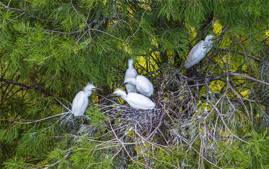 2025年6月17日,在安徽省合肥市廬江縣柯坦鎮(zhèn)城池村大漢塘池杉林中,成千上萬只牛背鷺、白鷺、蒼鷺等多種夏季候鳥在此棲息,聰明的它們藏身樹蔭避暑,筑巢、孵育度盛夏。