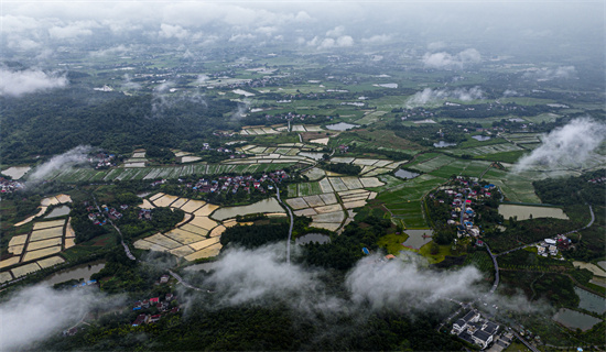 2025年6月22日,在安徽省合肥市廬江縣柯坦鎮(zhèn)大化村,雨后云霧繚繞,蔥翠的茶山與白墻紅瓦的村舍及大片農(nóng)田,勾勒出一幅盛夏季節(jié)的美麗山村新畫卷。