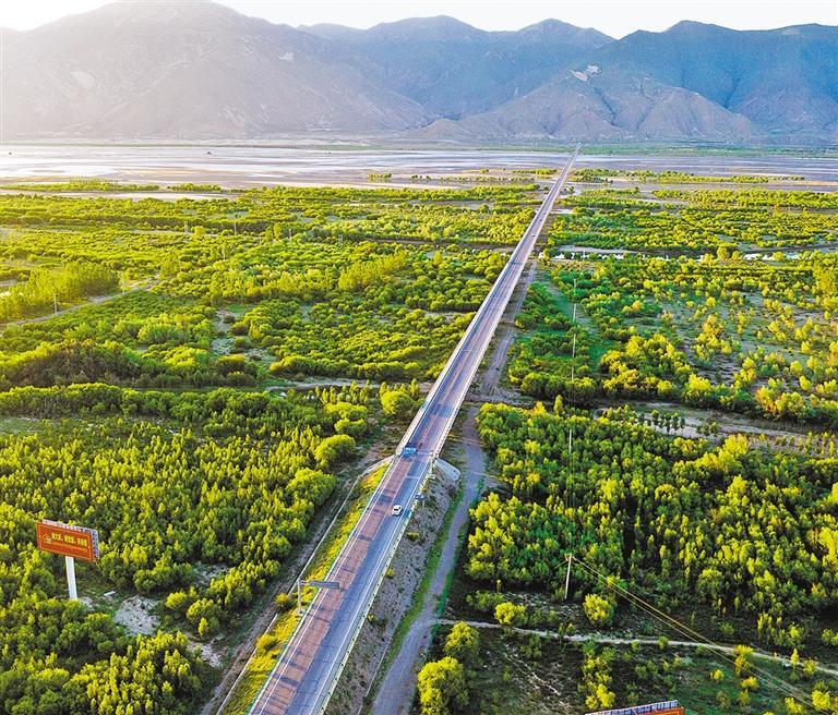 7月8日拍攝的山南市扎囊大橋,兩旁的沙荒地上綠意盎然。山南市大力開展生態(tài)文明高地創(chuàng)建工作,通過植樹造林打造生態(tài)綠廊,群眾的生活環(huán)境得到極大改善。次仁龍布攝(中經(jīng)視覺)