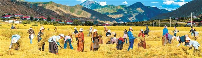 昌都市洛隆縣群眾在收割青稞。近年來,西藏糧食產(chǎn)量穩(wěn)步增長。2024年糧食總產(chǎn)量比1965年增長2.9倍,連續(xù)10年穩(wěn)定在100萬噸以上(攝于2024年9月)。