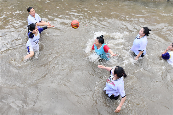 9月13日,貴州省凱里市萬潮鎮(zhèn)馬田村,群眾在打水上籃球競賽鬧豐收。(楊仁海 攝)
