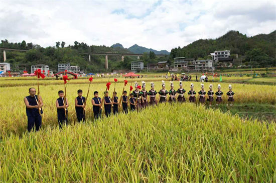 9月13日,貴州省凱里市萬潮鎮(zhèn)馬田村,師生們在田間吹奏蘆笙跳蘆笙舞鬧豐收。(無人機照片)(周建國 攝)
