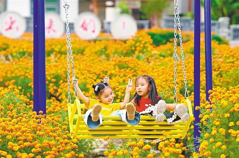 10月12日,小朋友在重慶市酉陽土家族苗族自治縣銅鼓鎮(zhèn)興隆村萬壽菊花海中游玩。