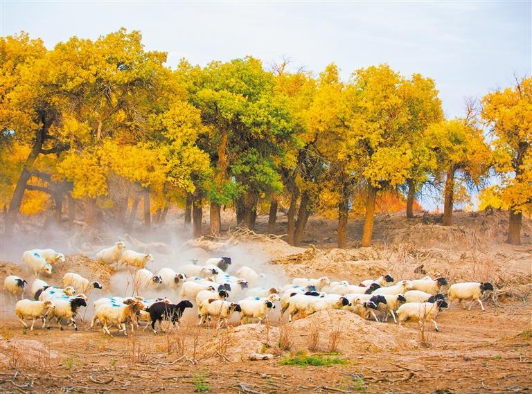 10月13日,內(nèi)蒙古自治區(qū)阿拉善盟額濟納旗達來呼布鎮(zhèn),羊群在胡楊林中覓食。