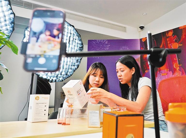 11月10日,海南??趶?fù)興城跨境數(shù)據(jù)服務(wù)產(chǎn)業(yè)基地,電商主播在直播間進(jìn)行準(zhǔn)備工作。