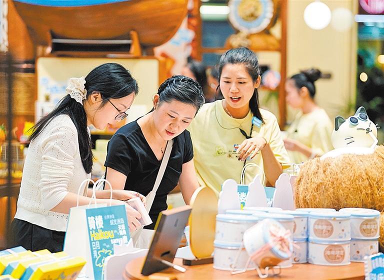 11月10日,游客在海南省??谑序T樓老街選購(gòu)文創(chuàng)產(chǎn)品。騎樓老街經(jīng)系統(tǒng)修復(fù)后持續(xù)創(chuàng)新消費(fèi)場(chǎng)景,前來(lái)選購(gòu)的游客絡(luò)繹不絕。