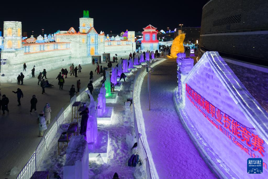 當日,黑龍江省首屆冰雕職業(yè)技能競賽在哈爾濱冰雪大世界正式開賽,18支代表隊的50多位冰雕選手冰城秀技,吸引眾多游客關注。