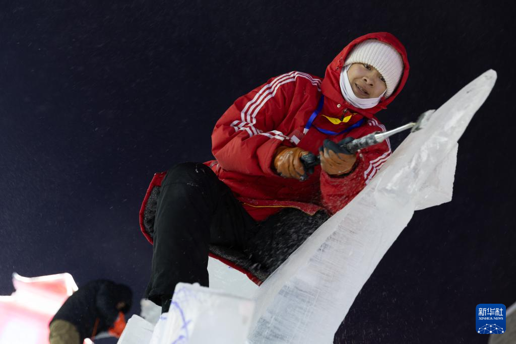 1月15日,參賽選手在哈爾濱冰雪大世界園區(qū)進行冰雕創(chuàng)作。