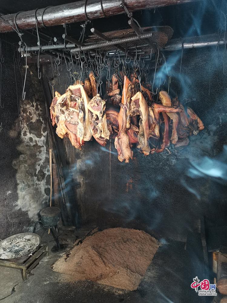 殺完年豬后,當(dāng)?shù)厝藭?huì)把上好的五花肉懸掛在火塘里熏制。四川和湖南等地區(qū)因地處山區(qū),環(huán)境氣候特別適合臘肉的腌制,還因農(nóng)家年豬都是用當(dāng)?shù)爻霎a(chǎn)的紅薯等糧食作物喂養(yǎng)而成,肉質(zhì)絕對(duì)上乘,腌制出來的臘肉具有色鮮、香醇、味美等特點(diǎn)。尹忠攝影