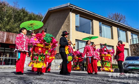 2025年2月4日,正月初七,安徽省合肥市廬江縣萬(wàn)山鎮(zhèn)長(zhǎng)沖村云里安凹民宿景區(qū),當(dāng)?shù)孛耖g劇團(tuán)表演旱地行舟、打年槍、挑花挑等非遺民俗節(jié)目,讓游客感受到民俗營(yíng)造的春天的味道。 (巢志斌 攝)