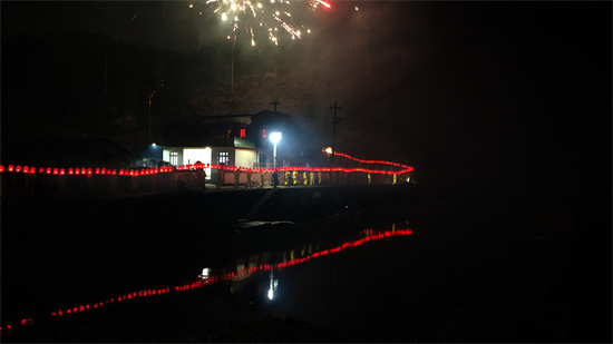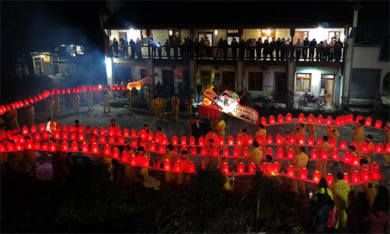 2月4日,大年初七,休寧縣鶴城鄉(xiāng)樟源里村村民舞起長長的板凳龍,歡慶蛇年春節(jié)。