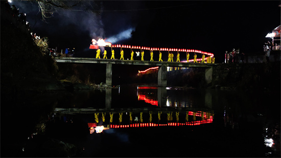 在歡快熱烈的的鑼鼓聲中,村民扛起板凳龍在村中穿行。這條長達百米的巨龍,由一塊塊板凳拼接而成。每塊板凳上都安放著4盞紅燈籠,燈籠內放置蠟燭。在夜色的映襯下,板凳龍通體紅亮,格外耀眼奪目。舞板凳龍是當?shù)卮迕襁^年的傳統(tǒng)習俗,也是最熱烈喜慶的活動。這時候,家家戶戶、男女老少都走出家門,觀看舞龍的盛況,歡聲笑語不斷,一片喜氣洋洋的熱鬧景象。
