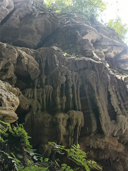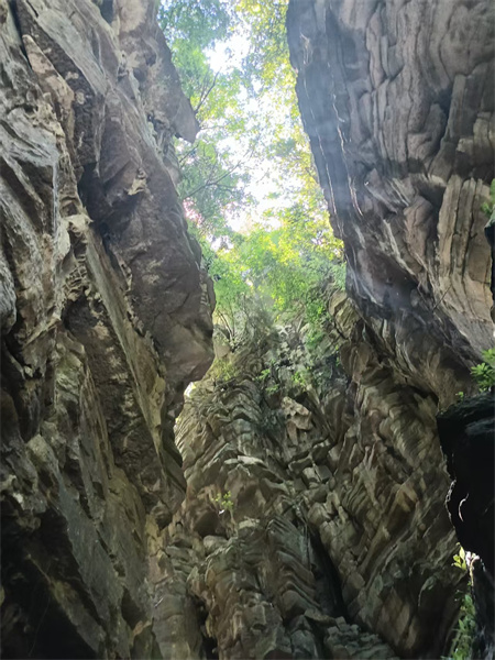 峽谷入口處,大山深處的石塊以一種十分規(guī)則的姿態(tài)疊放在一起,乍一看,酷似泥水工精心堆積而成,難怪它被賦予了“萬(wàn)卷詩(shī)書(shū)”這般富有詩(shī)意的名字。這些石塊,猶如一本本古老的書(shū)籍,靜靜佇立在時(shí)光的長(zhǎng)河中,每一頁(yè)都寫(xiě)滿(mǎn)了歲月的故事,等待著有緣人去翻閱、去解讀。撫摸著這些石塊,指尖傳來(lái)的是歲月的紋理,心中涌起的是對(duì)大自然鬼斧神工的驚嘆。
