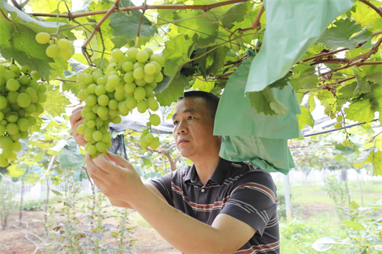 王偉在采摘葡萄。(唐蘭榮 攝)