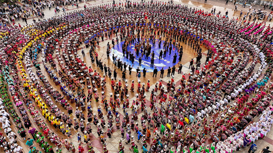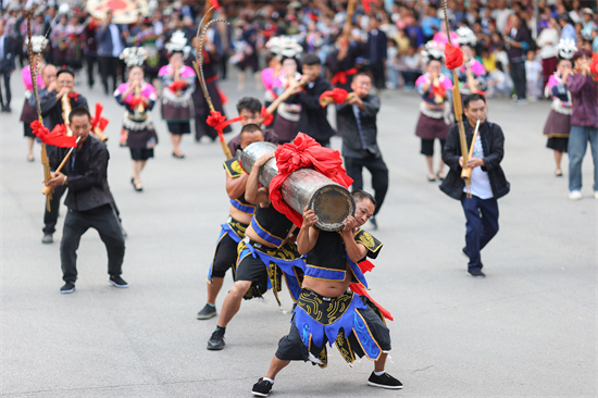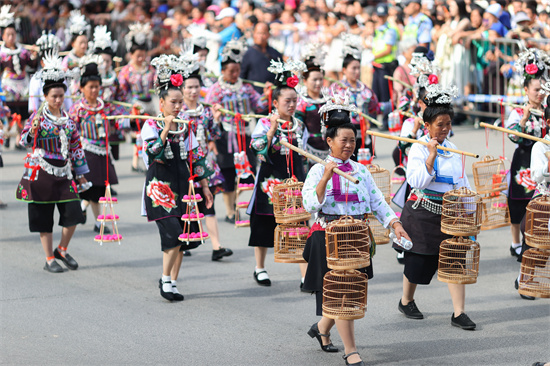 9月20日,在貴州省丹寨縣,身著傳統(tǒng)服飾的群眾在巡游展演中跳古瓢琴舞。