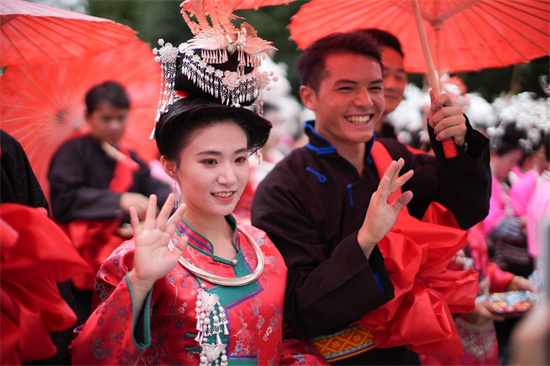 9月20日,在貴州省丹寨縣,身著傳統(tǒng)服飾的群眾在巡游展演中撒“喜糖”。