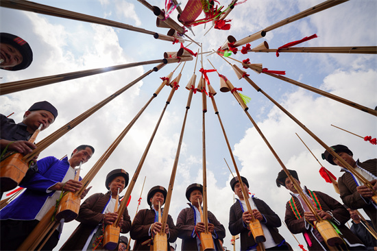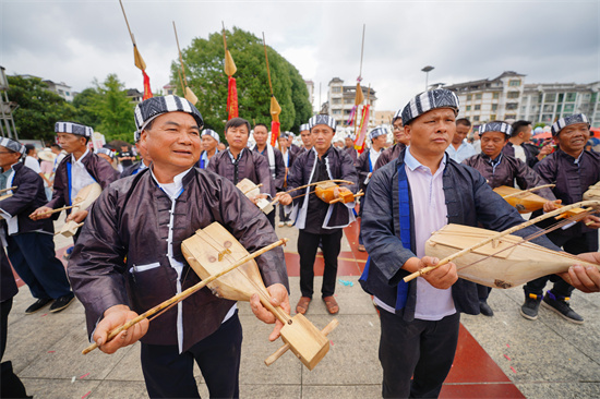 9月20日,在貴州省丹寨縣,身著傳統(tǒng)服飾的群眾在巡游展演中吹奏蘆笙。