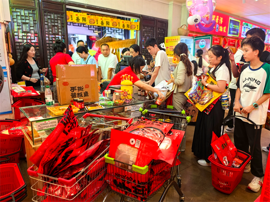 同時(shí),岳陽城區(qū)商超零售人氣攀升,消費(fèi)購物熱情高漲。在岳陽樓景區(qū)汴河街中華老字號(hào)“十三村”特產(chǎn)店,人頭攢動(dòng),張燈結(jié)彩,以“湘超”為主題精心布展,“為湘超助力、為岳陽加油不加價(jià)”宣傳牌比比皆是,貨架上擺滿了琳瑯滿目的中華老字號(hào)產(chǎn)品,包括香菇醬、手撕醬板魚、醬板鴨等 。